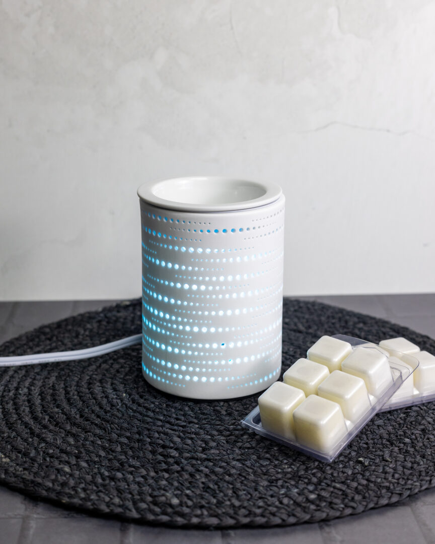 Ce brûleur électrique fait de céramique blanc offre une lumière douce et agréable. Il change de couleurs 7 fois et peut être arrêté sur une couleur.