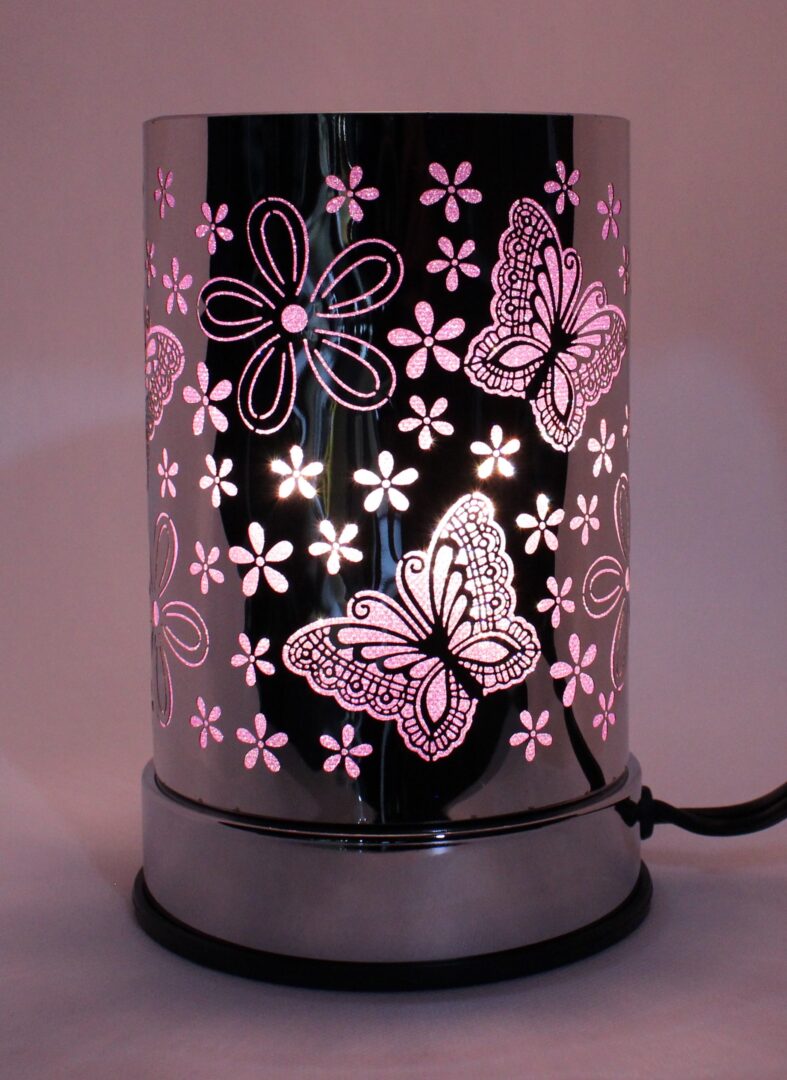 Magnifique brûleur de cire et d'huiles essentielles en métal argenté avec des motifs de papillon mauve. Cet lampe est tactile et fera une décoration parfaite pour la maison.