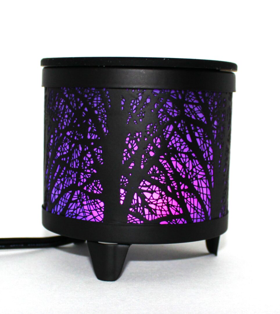 Jolie brûleur de cire en métal noir avec 7 couleurs en alternances, idéal comme lampe décorative.