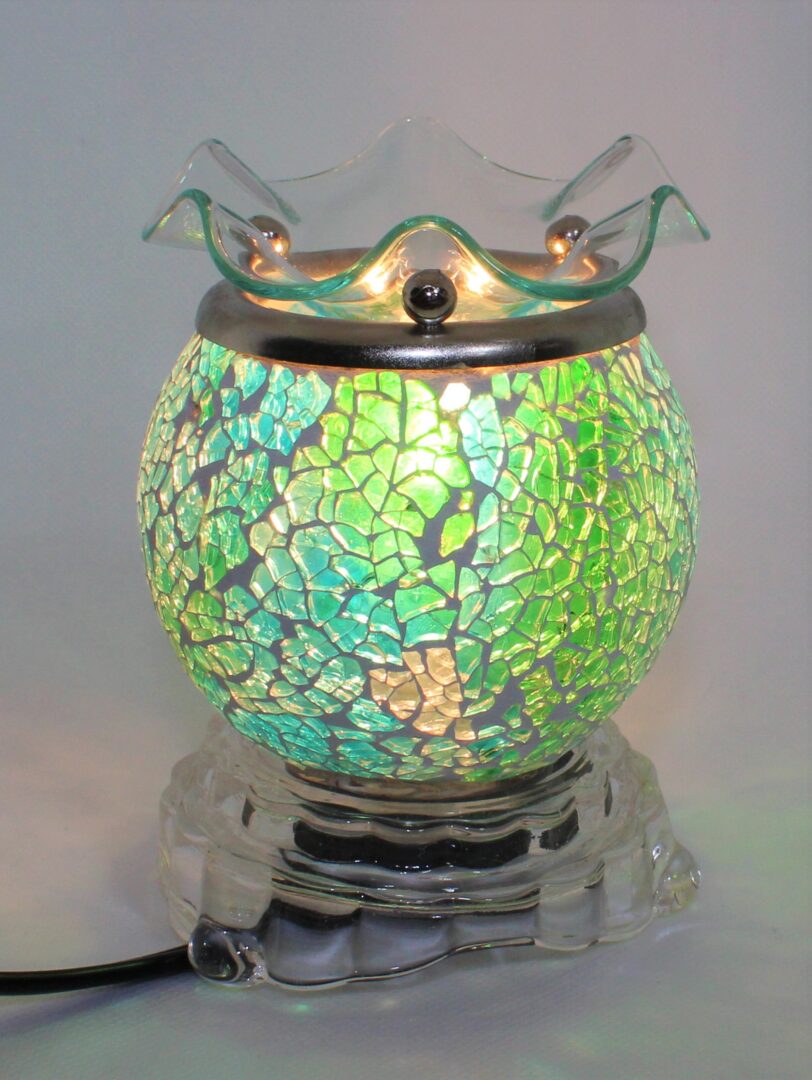Superbe brûleur de cire en mosaïque de verre bleu et vert fait à la main. Ce brûleur est électrique et également une veilleuse pour la maison.