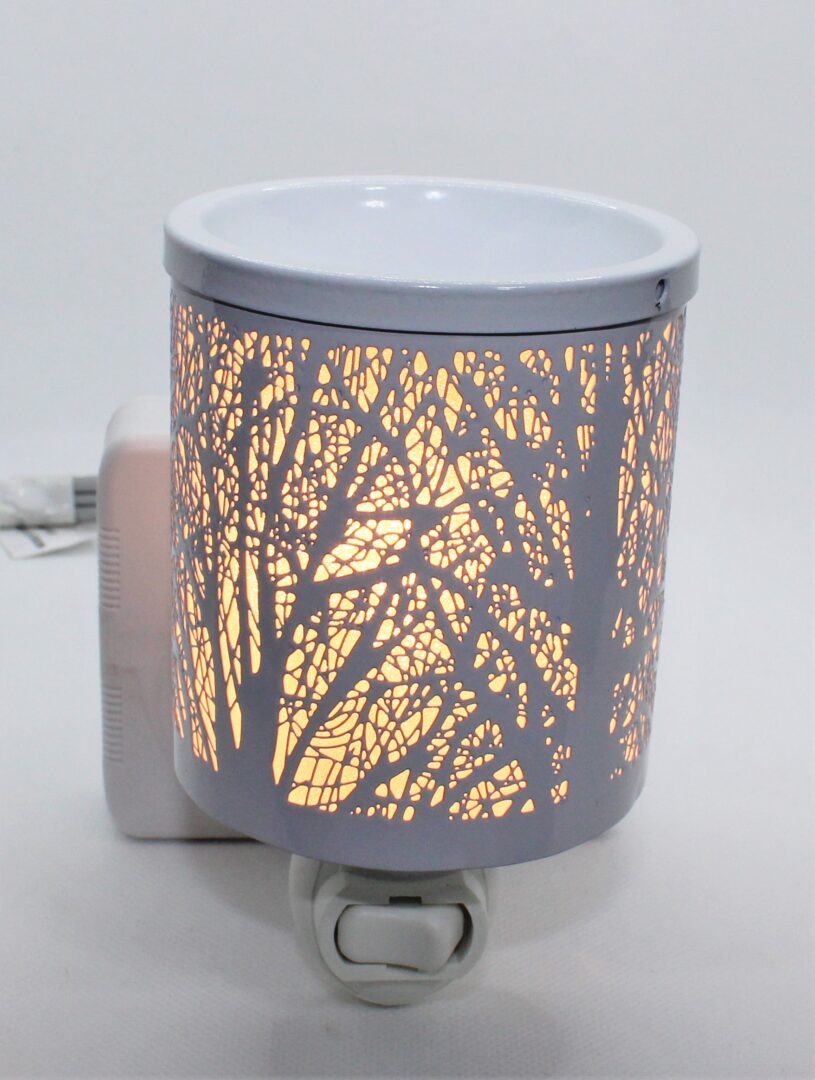 Brûleur de cire mural au motif de forêt en métal blanc. La parfaite petite veilleuse.