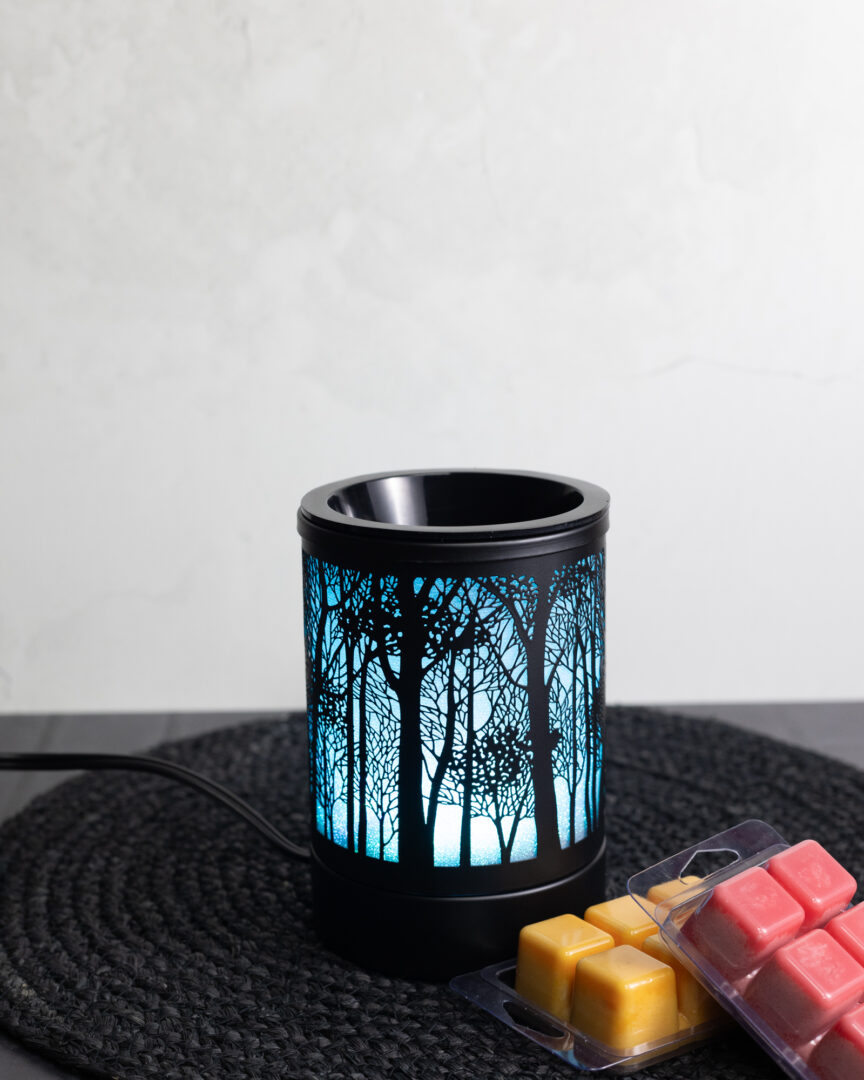 Jolie brûleur pour cube de cire électrique arborant un coucher de soleil à travers une forêt. Ce diffuseur change de couleur 7 fois. Vous pouvez aussi choisir la couleur que vous désirez et il restera sur cette couleur sans changer.