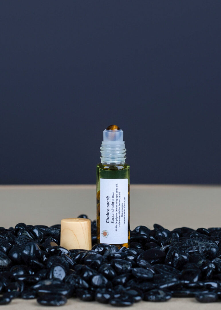 Le chakra sacré : Situé au-dessus des organes génitaux, il est relié au sacrum, à la base de la colonne. Sa couleur est l’orangé et sa pierre l’œil de tigre. Sa signification est la procréation, la famille, l’imagination, l’ouverture à autrui, l’échange, le contact, la créativité et la sexualité. Il gère l’émotionnel, la sensibilité, la relation à autrui, donner / recevoir, les échanges, l’amitié et le besoin de fusion avec l’autre et l’univers. Domaine des plaisirs à s’offrir, à recevoir ou à donner : je m’autorise, par les sens, à la joie de vivre, je profite de la vie : appétit, sensations, enthousiasme et chaleur.  Qualité: Connaissance et Créativité. «  Je ressens«